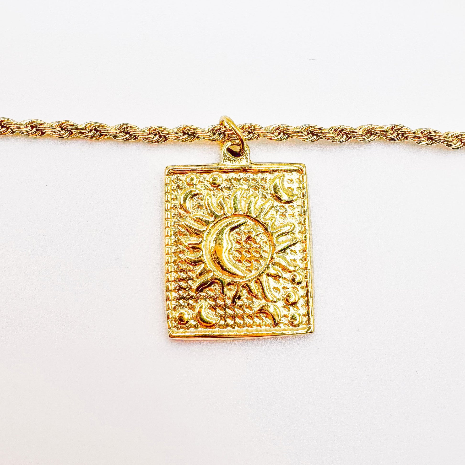 Material acero inoxidable dorado con dije sólido de sol y luna.