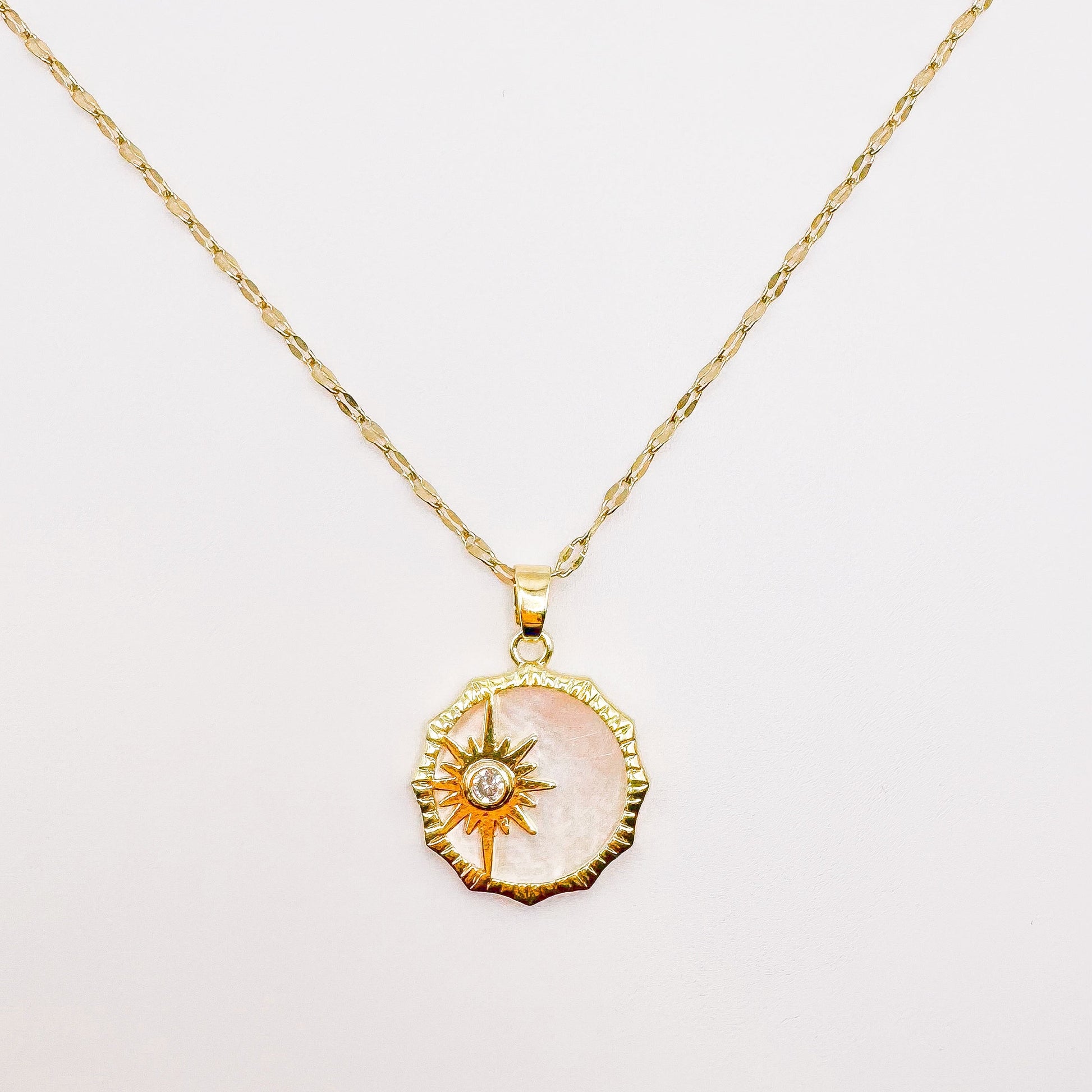 Material acero inoxidable dorado con dije nacarado y punto de luz.